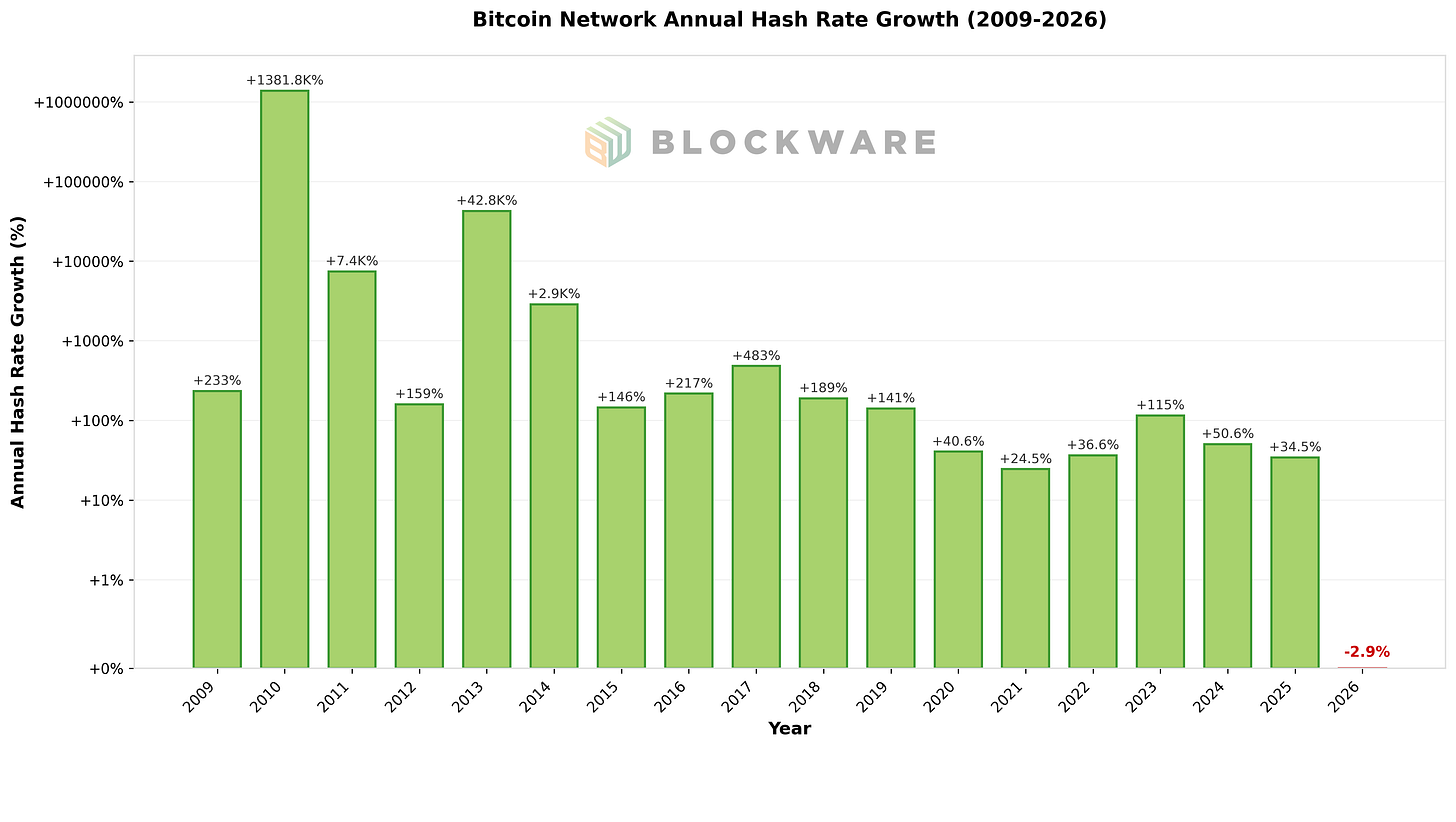 Bitcoin Hash Rate Down 2.9%, 2026 on Pace For Slowest Growth Yet