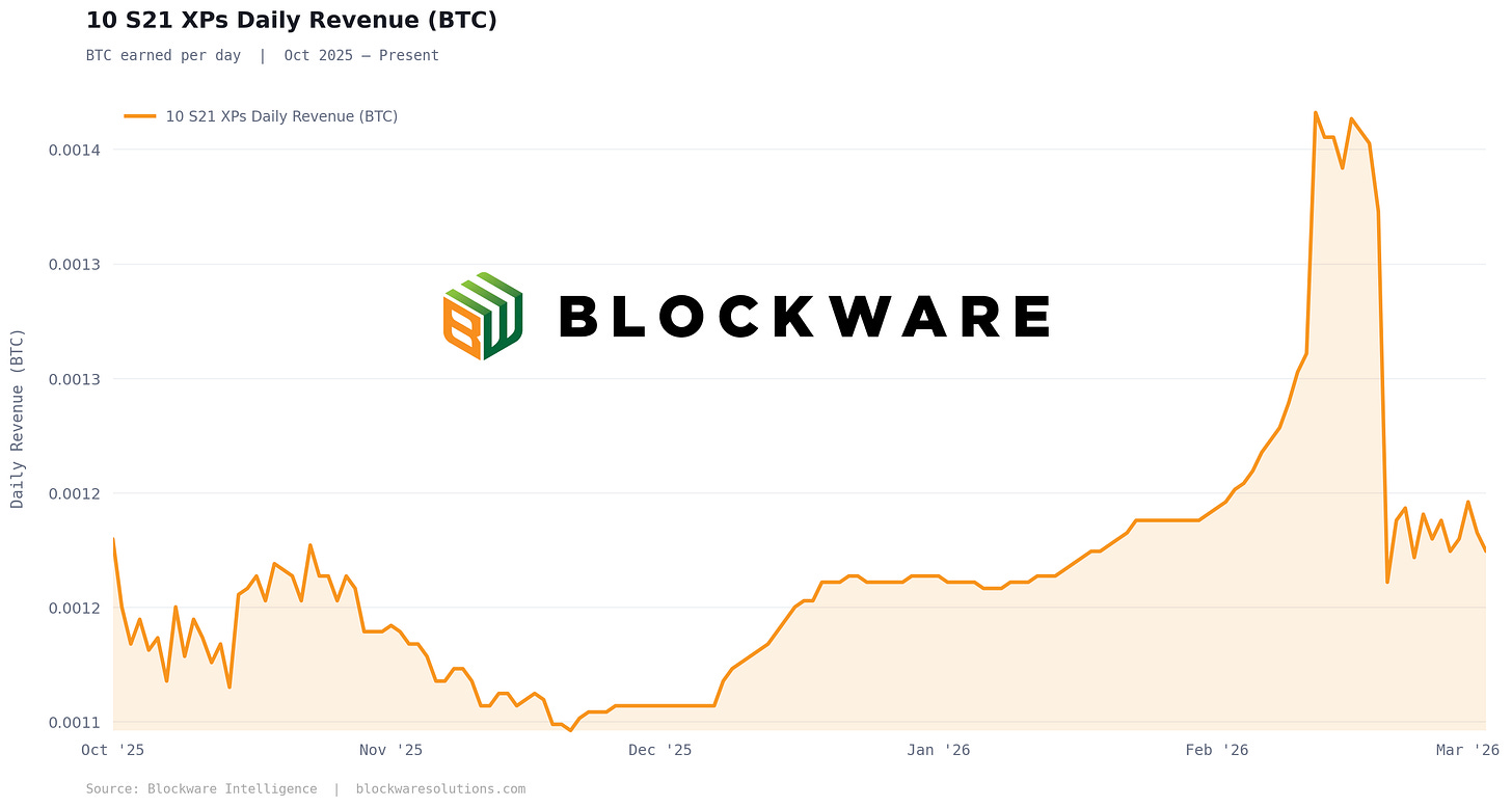 ~450 Bitcoin are mined every day. No more, no less. Fewer miners competing for these 450 BTC means every miner gets a little bit more. The chart below shows the daily BTC earnings for a miner running ten S21 XP 270’s.