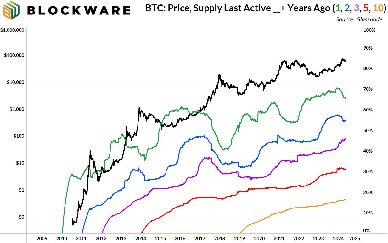 Lastly, the orange line represents the % of coins that haven’t moved in at least 10 years. We can reasonably assume that the keys to most of these coins were lost, and that they'll never move again. It’s incredibly difficult to HODL for 10+ years, resisting the temptation to spend during bull markets, and having stone-cold resilience during bear markets. It’s not to say that old coins never move, that happens. But more coins are being held and aging into the 10+ year cohort than there are old coins moving, as evidenced by the fact that this line is up-only.
