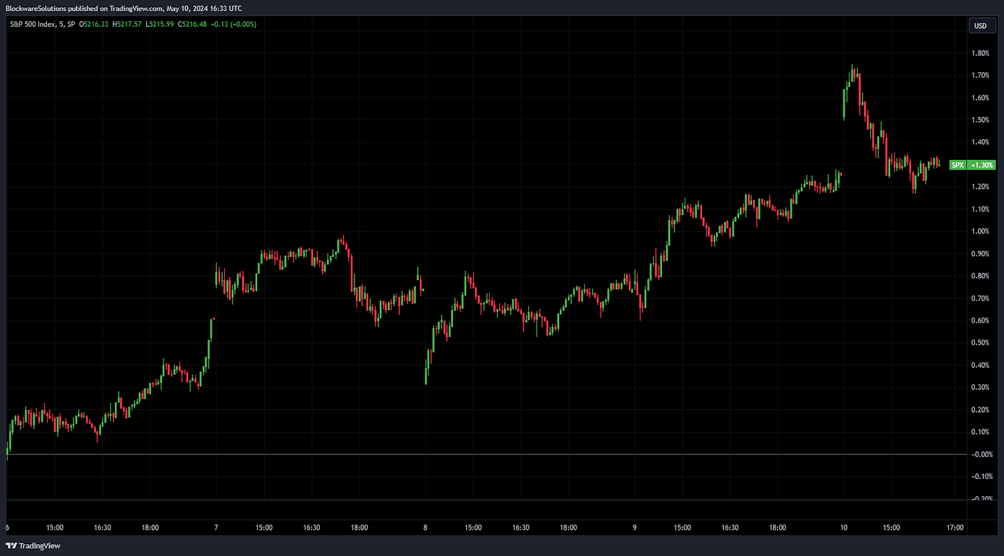 Overall, this week was relatively uneventful in terms of equities and the broader macroeconomic landscape. No Fed meetings, no important data releases. The S&P is up ~1.3% over the past five days and, like Bitcoin, it remains in a funnel of sideways price action just beneath its all-time high.