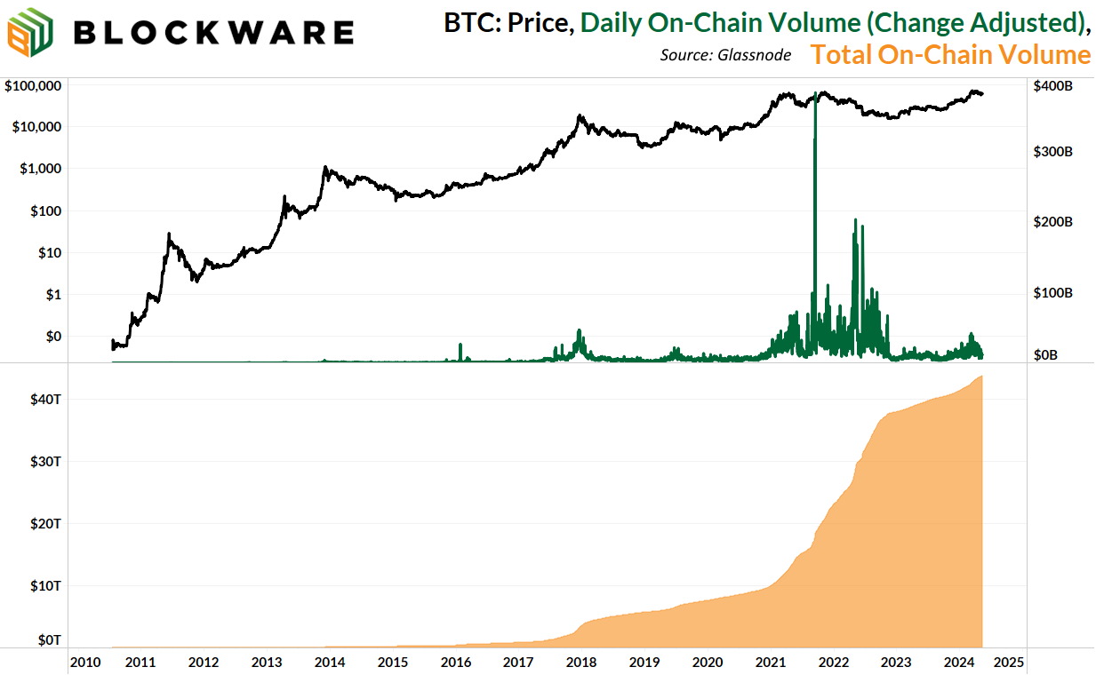 In total, across these 1 billion on-chain transactions, adjusting for change back UTXOs, the Bitcoin network has processed $43 trillion worth of transactions. And ¾ of that $43 trillion has come since 2021. For reference, that’s nearly on-par with Visa who processes roughly $10 - $11 trillion per year.