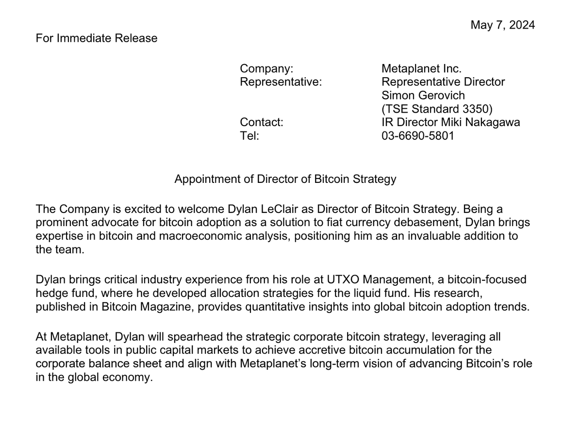To help implement this strategy, Metaplanet hired popular Bitcoin analyst and thought leader Dylan LeClair. Dylan has been incredibly vocal about his admiration for MicroStrategy and their approach to Bitcoin. In the past he’s produced in-depth content breaking down just how clever the corporate Bitcoin strategy is, and he’s described it as “The Biggest Story in Corporate Finance.” Metaplanet definitely hired the right man for the role, and it will be fun to watch how things unfold for the company going forward. The race to secure a share of the 21,000,000 is heating up.