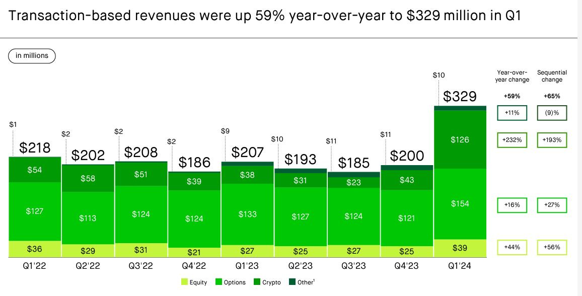 Robinhood reported $126 million in revenue generated from crypto-based transactions in Q1; a 193% increase from the quarter prior. This substantial increase in volume/revenue likely comes on the back of the ETF launch. This shows us that there is an appetite for ETFs, not just at the institutional level, but at the retail level as well.