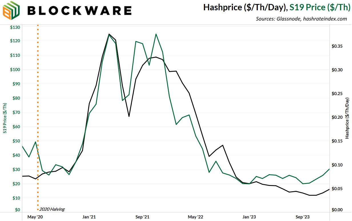 With hashprice at near all-time lows, ASICs are at historically cheap prices right now! Hashprice and ASIC prices tend to move in tandem (the chart below shows the movement of both during the last cycle). If you’re bullish on the price of BTC, then now is the time to deploy capital into mining. ASICs likely won’t be getting any cheaper.