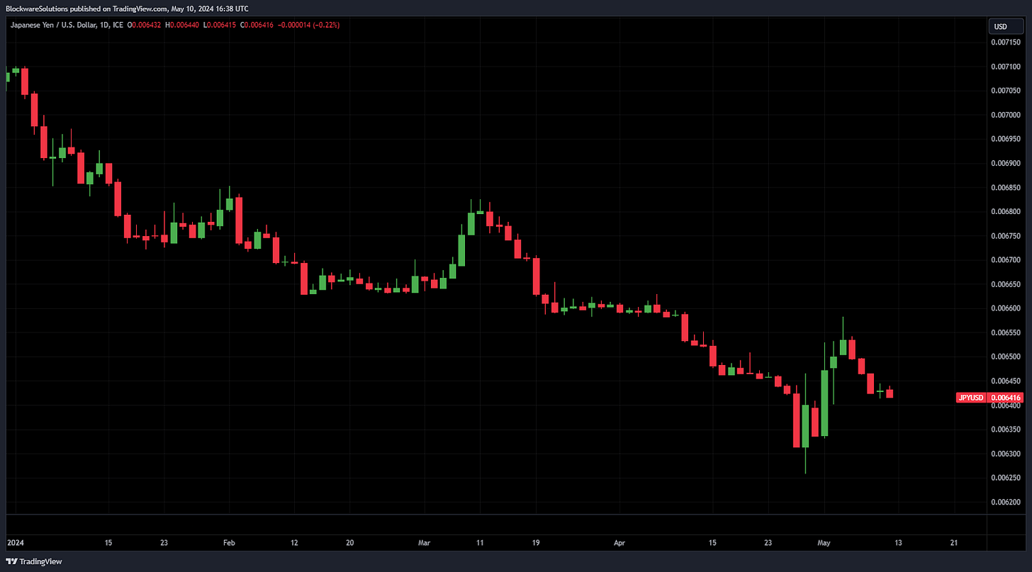 JPY/USD posted a few red candles this week and is headed back towards the level at which the Bank of Japan intervened. Given the rapid and seeming unstoppable devaluation of the Yen, it's not surprising that the first Microstrategy copycat came out of Japan.