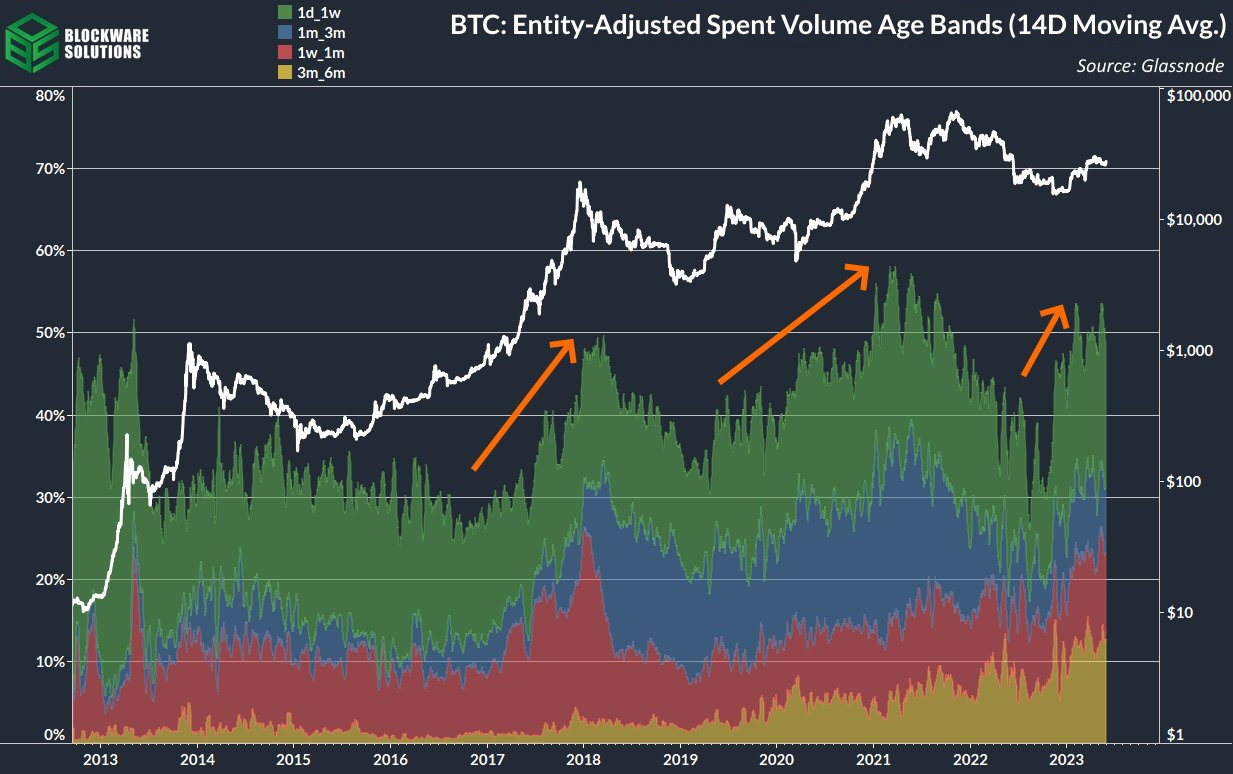 Over 50% of on-chain transactions are from short term holders, a rate on par with that of bull markets.