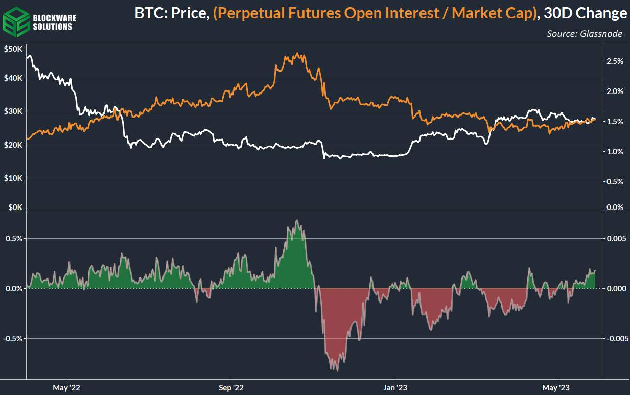 Frequent readers know that, to gauge how leveraged a position the market is in, we like to look at perpetual futures open interest as a % of the total BTC market cap.