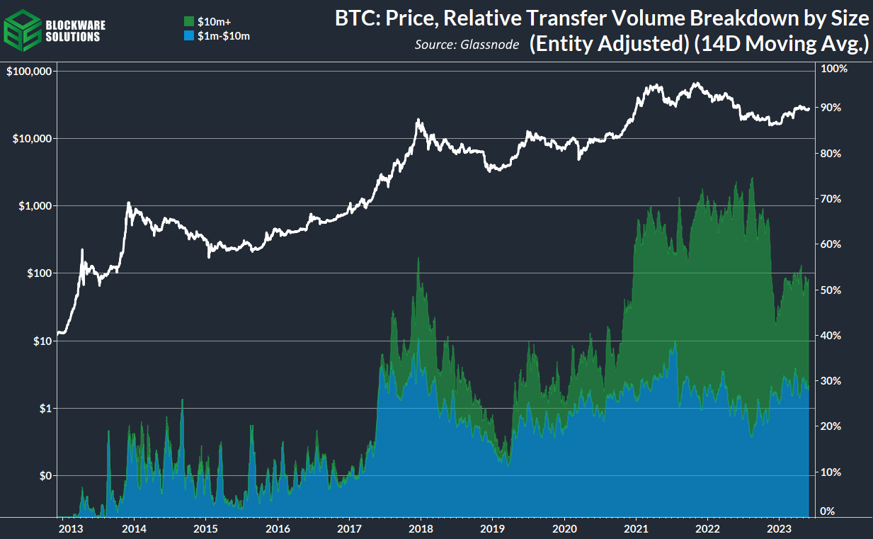 Over 50% of on-chain transfer volume comes from transactions over $1,000,000 worth of BTC.
