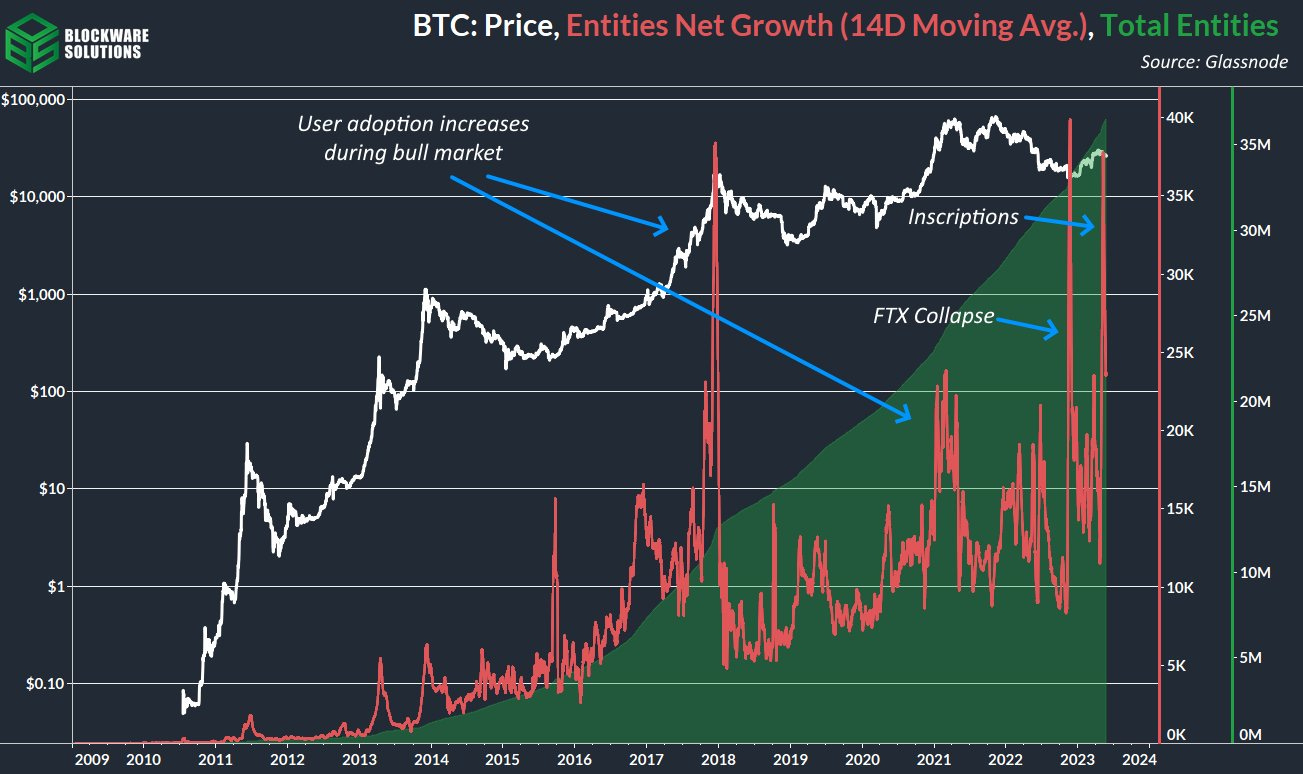 Total on-chain entities increases significantly due to the rise of inscriptions.