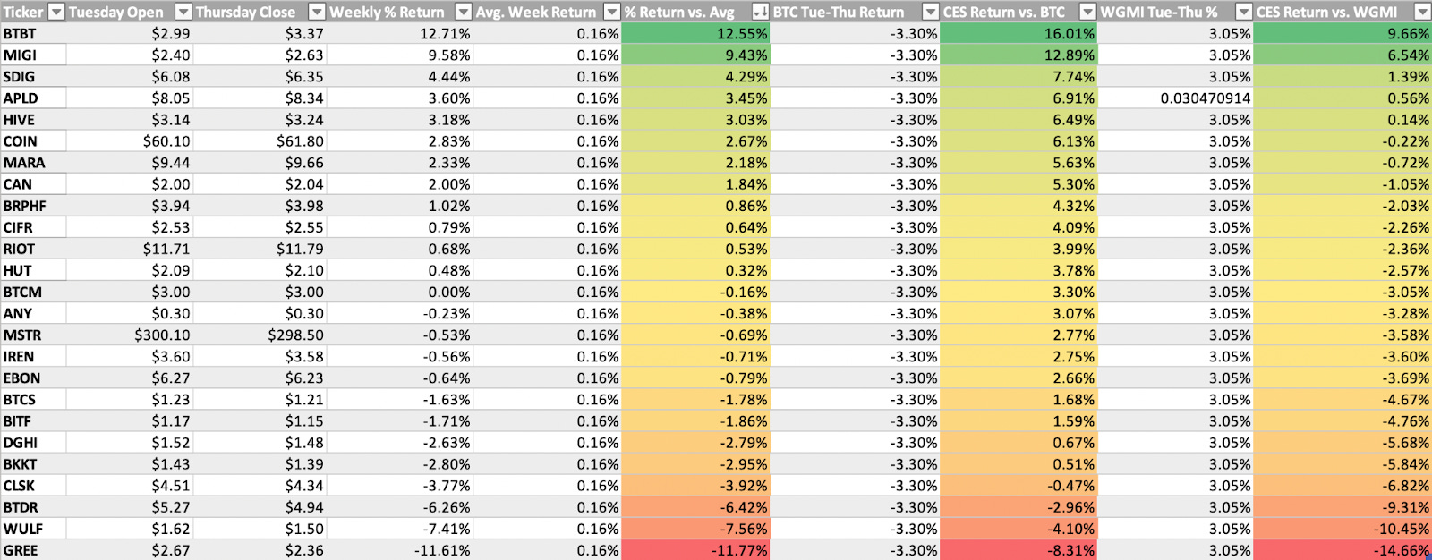 Above is the excel sheet comparing the Tuesday-Thursday performance of many Bitcoin exposed equities to that of Bitcoin, and Valkyrie’s Bitcoin Miners ETF (WGMI).