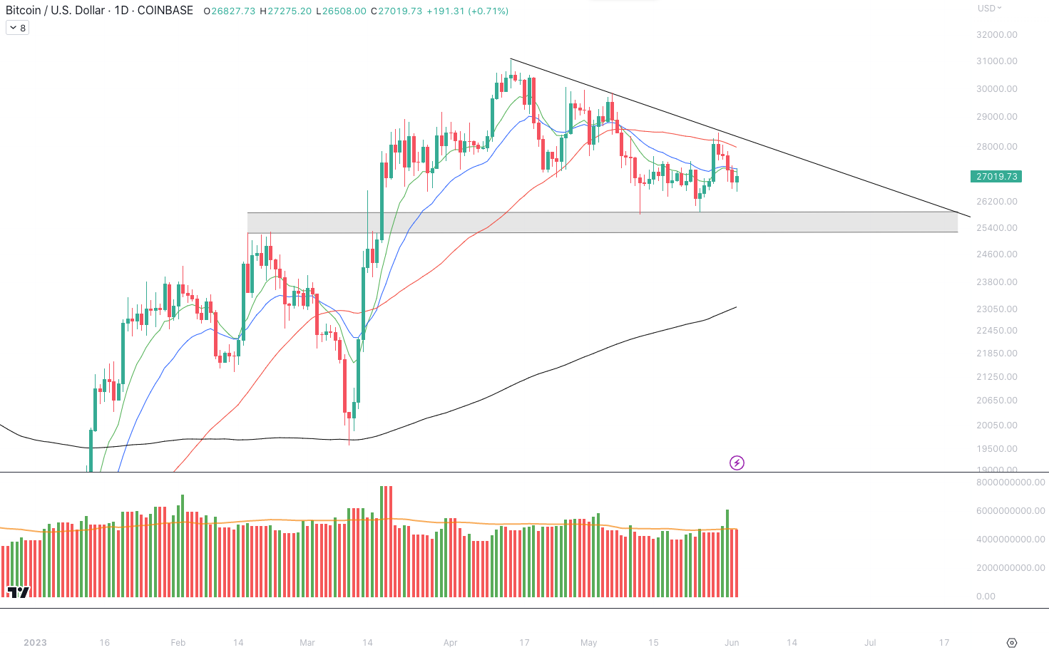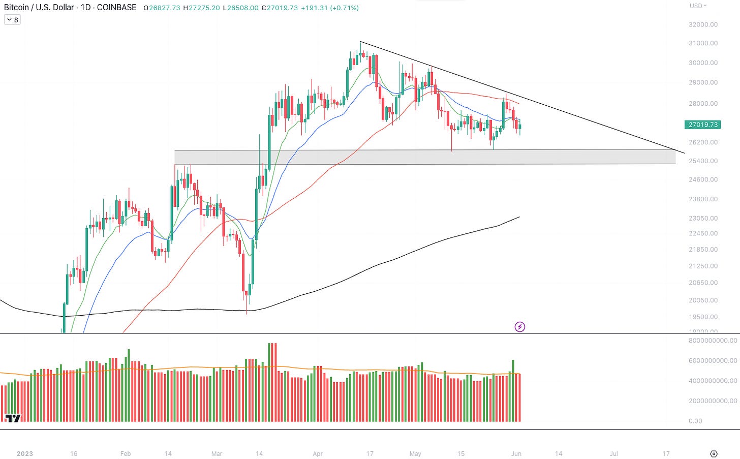 The chart above displays the lower and upper bounds of BTC’s current range. ~$25,900 has continued to provide support for price, while the descending trend line has defined the upper bound of this channel.