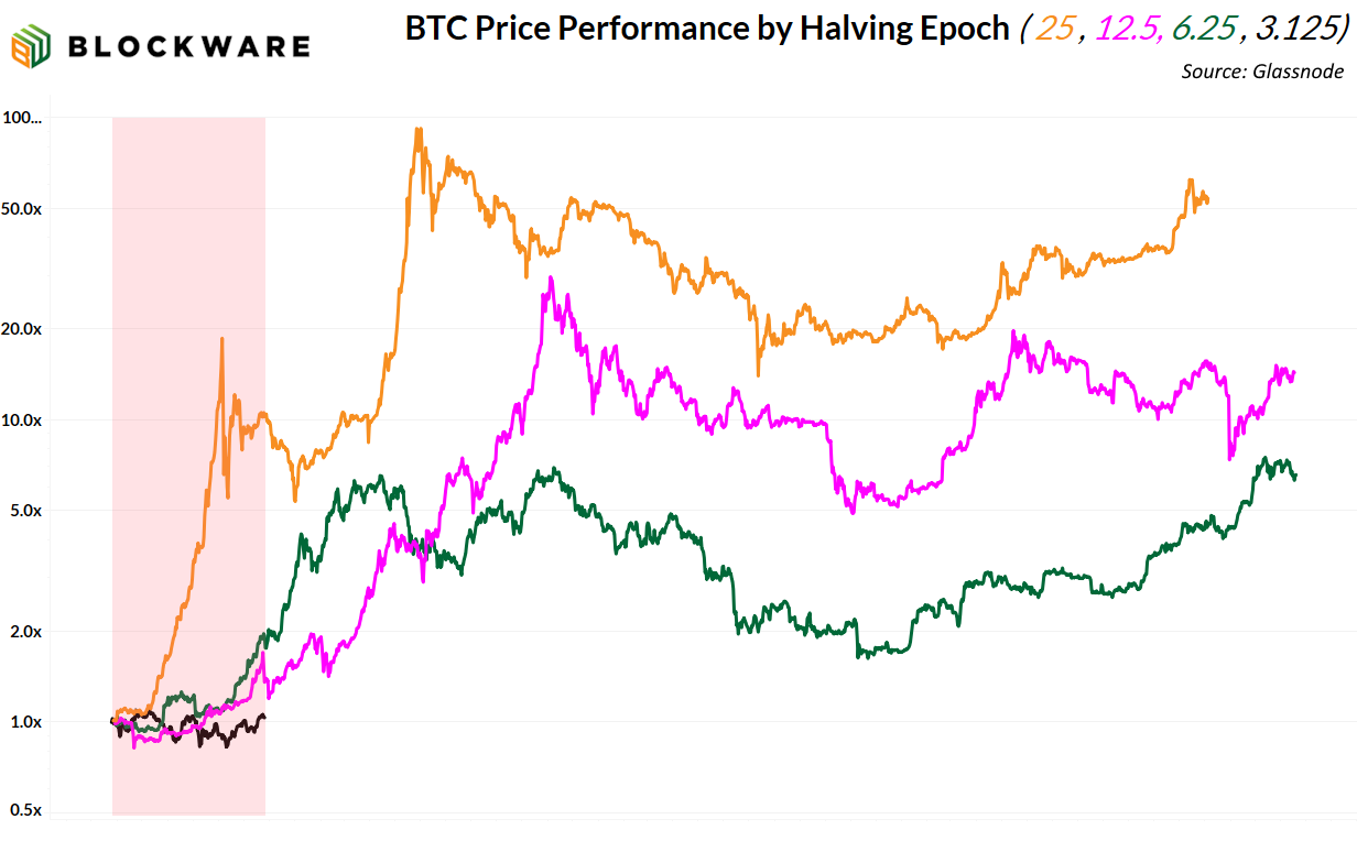 The chart below shows how the current halving epoch stacks up to previous epochs. The current cycle appears to be lagging slightly, but we are right around the point where BTC began to rip in previous cycles. It has been our view â and still is our view â that after the 2024 US Presidential election is when BTC will start to pick up steam.