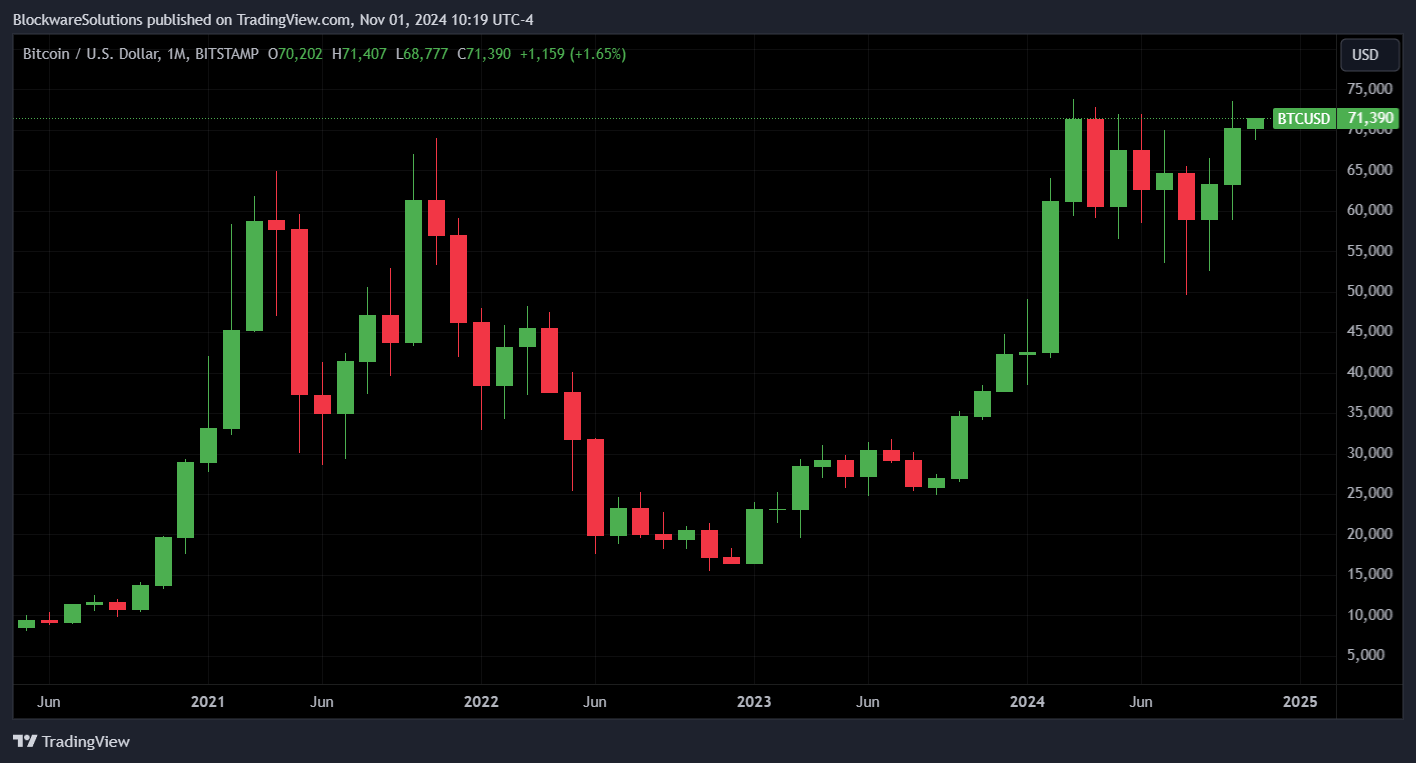 “Uptober” did not disappoint. Despite little-to-no fanfare outside of the niche corners of the internet where Bitcoin enthusiasts reside, BTC has resurfaced above its 2021 high. From open to close, the net gains for October were +10.8%.