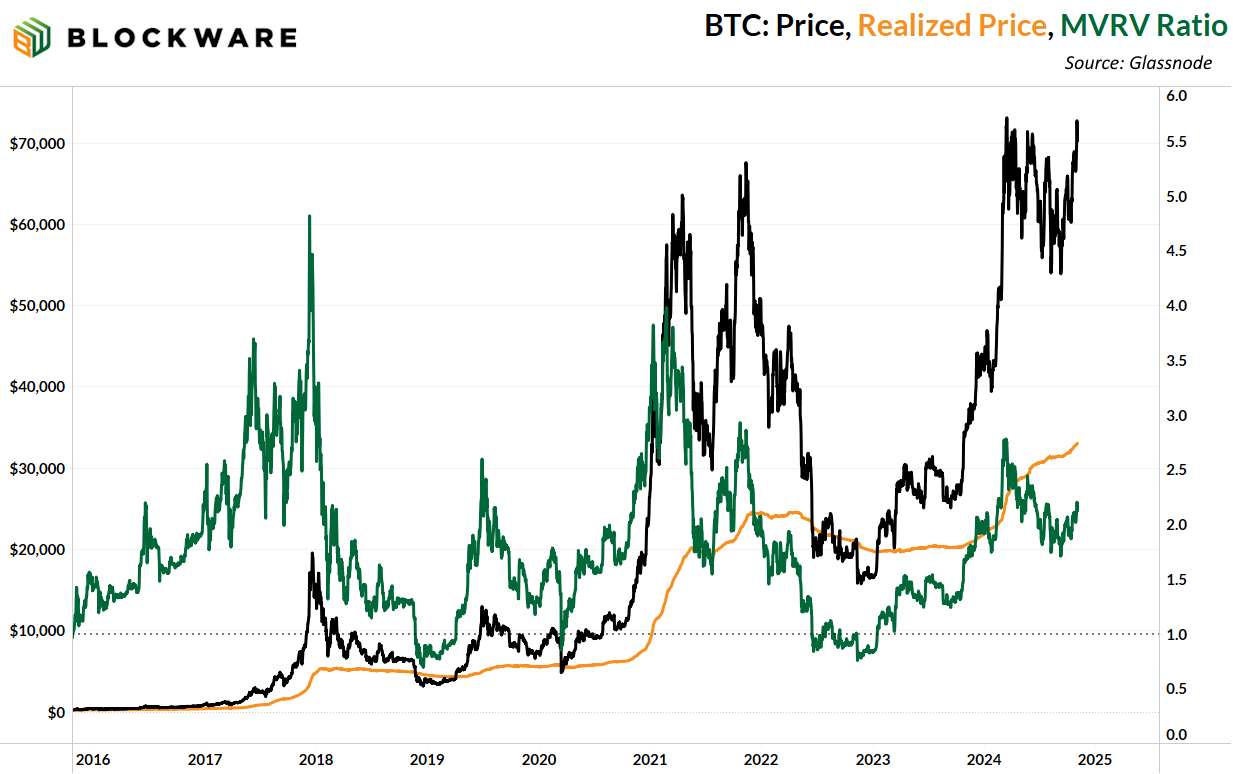 The closer the market price is to the realized price, the less likely it is for the BTC price to decrease. This is pretty intuitive – if there’s a large amount of unrealized gains in the market, then the incentive for holders to sell some coins is going to be stronger. 2025 has a strong possibility of bringing a bitcoin bull market, so we’ll be looking at the MVRV Ratio closely to see if the market may be getting frothy. In the past two cycles, the MVRV Ratio peaked at over 3 during the top.