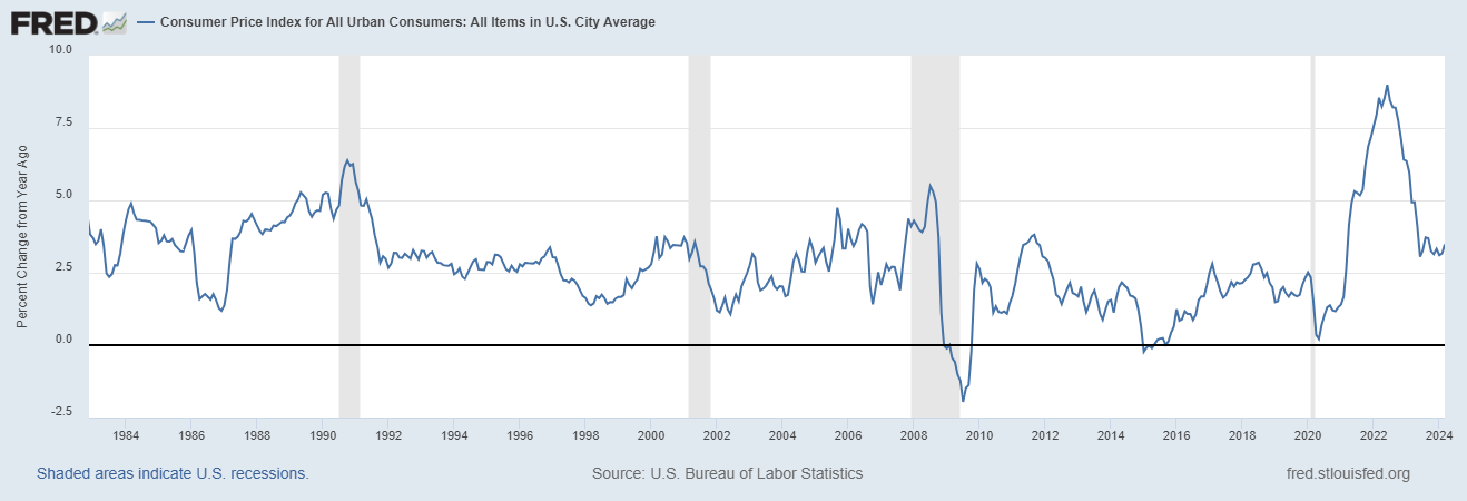 Year-over-year CPI change came in at ~3.47%. This was the second consecutive month of accelerating inflation, and the highest print since September of last year. The Fed should not hold its breath waiting for CPI to hit their (arbitrary) target rate of 2%.