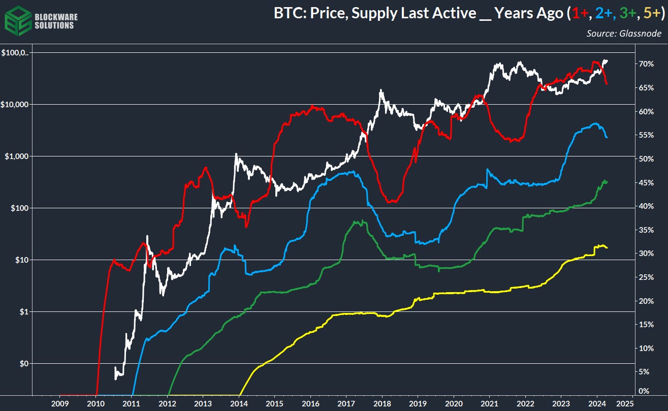 However, what’s worth noting is that the supply of coins last active 3+ years ago has remained relatively flat while the younger cohorts have begun tapering down. Coins last moved 3-ish years ago were bought close to all-time highs while coins bought within the past 1-2 years were bought at bear market prices, and have more gains to realize. Further price appreciation will be needed to pry the coins bought at last cycle’s top to be parted with.
