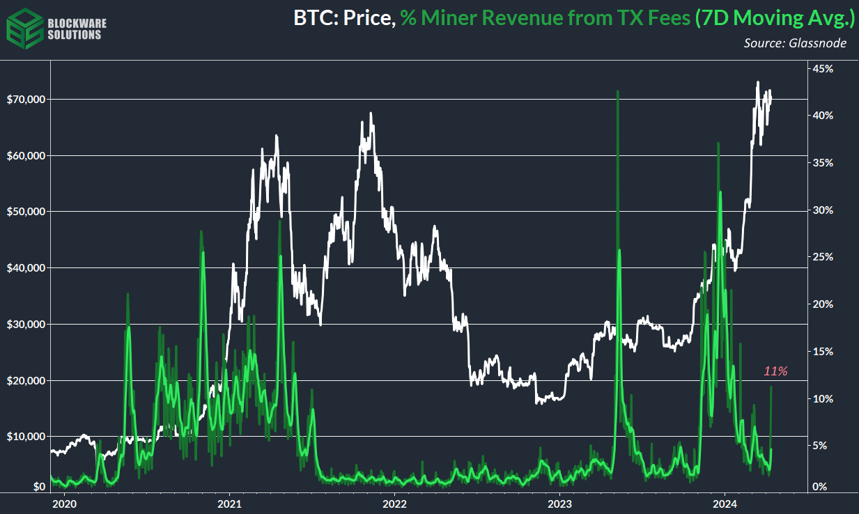 On-Chain transaction fees are rising as we head towards the 2024 Halving. On Thursday ~11% of Bitcoin mining revenue came from transaction fees. We saw fees rise in a similar fashion in the aftermath of the 2020 halving. This time may be even more potent given the increasing popularity of ordinals and inscriptions, which resulted in elevated on-chain fees throughout much of 2023.
