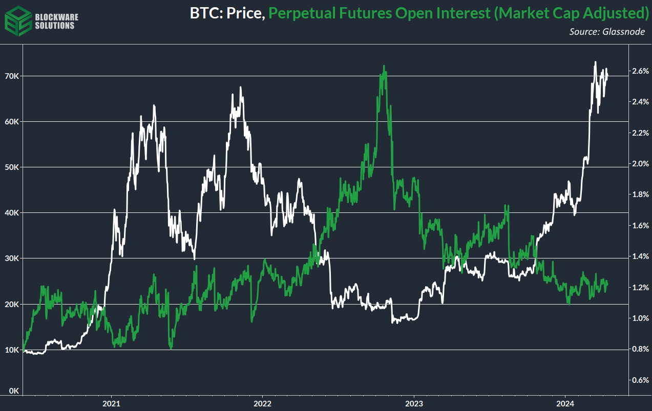 Things are relatively quiet in the BTC derivatives market. Historically, during periods of prolonged price consolidation, we’ve seen a rise in open-interest relative to market cap. That signals investors opening up newer positions faster than their existing positions can close due to price volatility (perpetual futures have no expiration date). We’re not seeing that during this regime of consolidation. The likely case is that investors are exercising caution as we approach a significant milestone for Bitcoin: the halving. Moreover, this is still the preliminary stages of the bull market, and ansty retail investors are not yet present to the degree they were in 2021 & 2022.