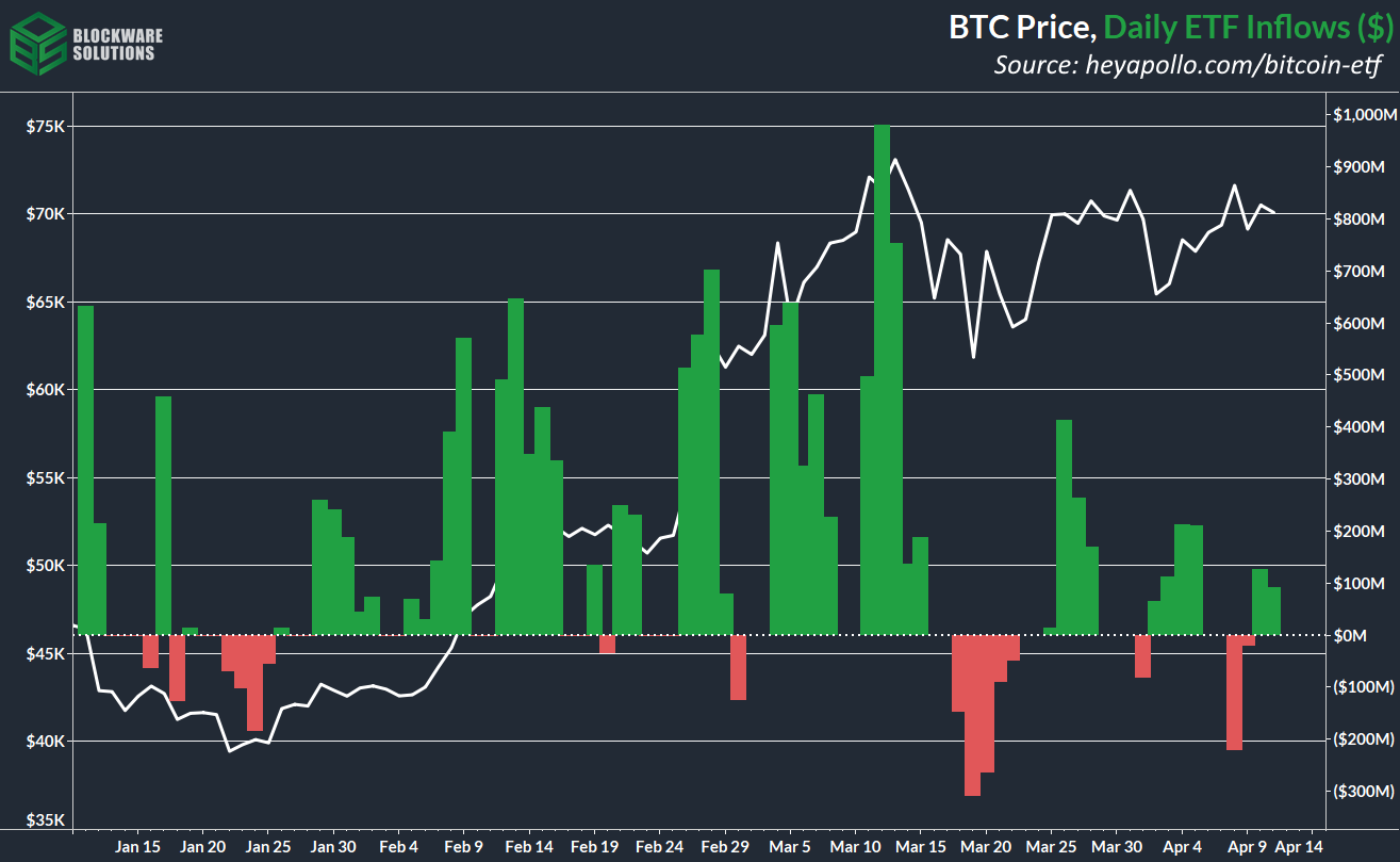 The Spot Bitcoin ETFs had their third lightest week of inflows since inception, denoted by ~$200 million in net outflows on Monday. However, inflows have been positive throughout the latter half of the week.