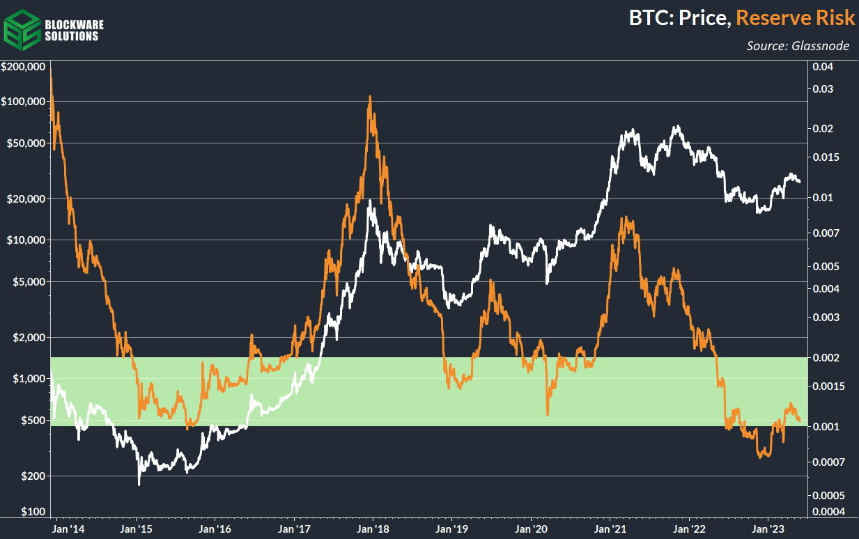 Reserve risk quantifies this effect. At points in which price is down and supply is contracting into price-agnostic holders, it’s a sign of a low risk bottom. You can clearly see the vast difference in market conditions between now and 2019.