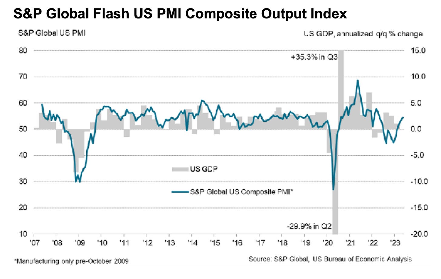 As you can see above, the latest Flash Composite PMI, released on Wednesday, sits at 54.5, well above estimates of 50.0.