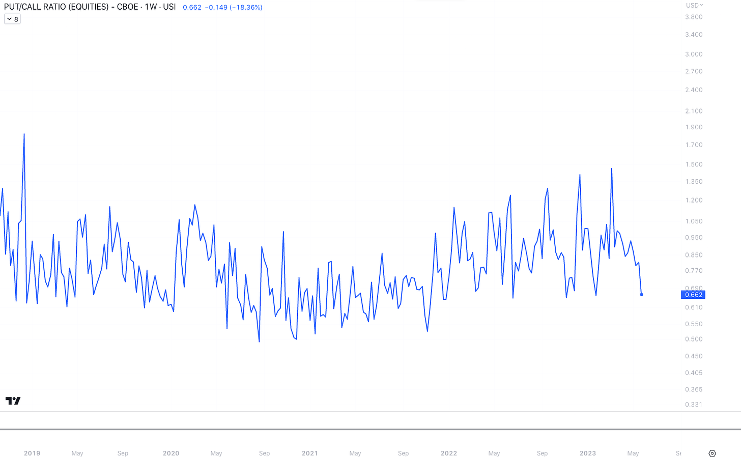 As we’ve just mentioned, sentiment has also grown to be quite overheated as of recently. The equity-only put/call ratio has dipped down to ~0.66, its lowest level since the market began its rally in January.
