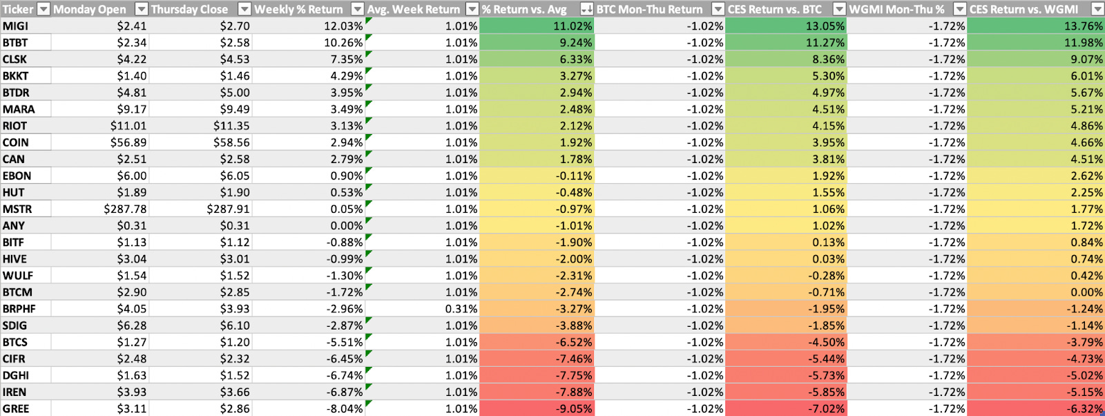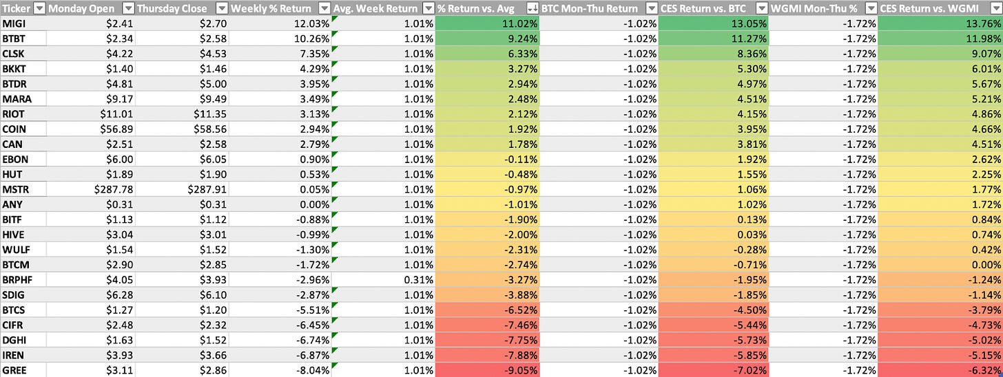 Above, as always, is the table comparing the Monday-Thursday performance of several Bitcoin-exposed equities.