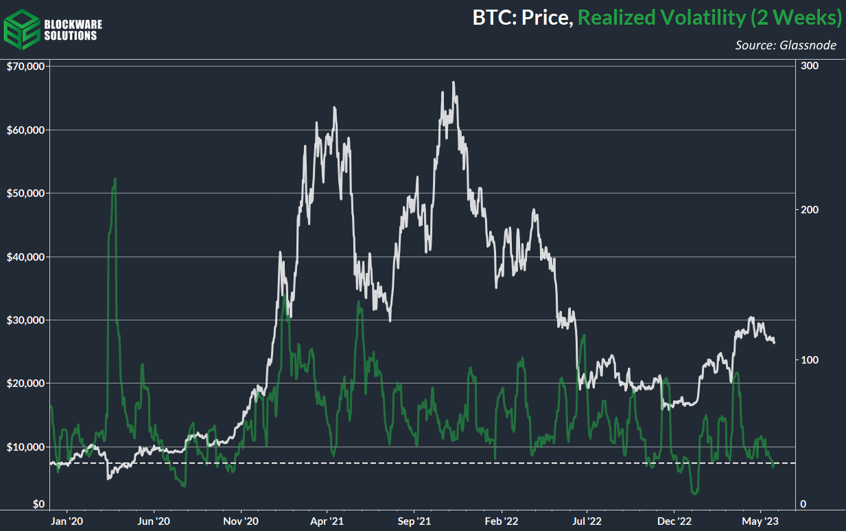 Alongside the impending support test, low realized volatility further signals that price is likely to make a big move soon. Volatility (2 week measurement) has not been this low since right before the jump to $20,000 in January.