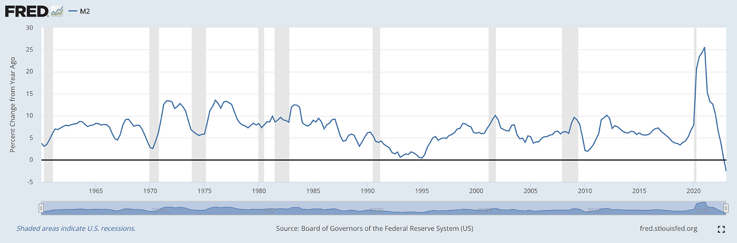 As of Q1 2023, M2 growth is down to -2.6% YoY, its largest decline on record (data begins in 1959).