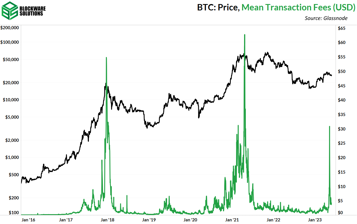 A big question moving forward is what will fees look like for the rest of 2023. Will we see another strong ordinal phase where fees soar again or was that mostly a passing fad? Time will tell, but it appears that the core consistent steady demand for Bitcoin blockspace will likely be BTC transactions, not ordinals.
