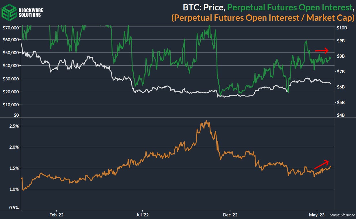 Perpetual futures open interest has moved sideways for the past month. On a market cap adjusted basis, it has trended slightly up during this time, understandably so as price has trended slightly down respectively.