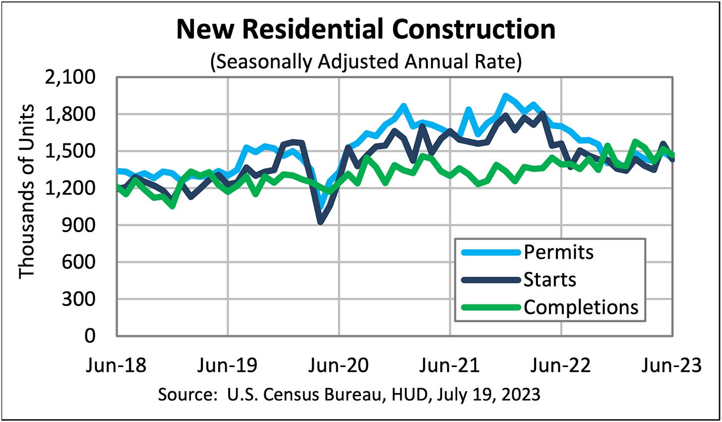 3. New Residential Construction Starts. US residential housing starts declined 8.0% in June, as the US 30-year average fixed mortgage rate nearly cracked above 7.0% last week. It appears that the housing recession may be underway.