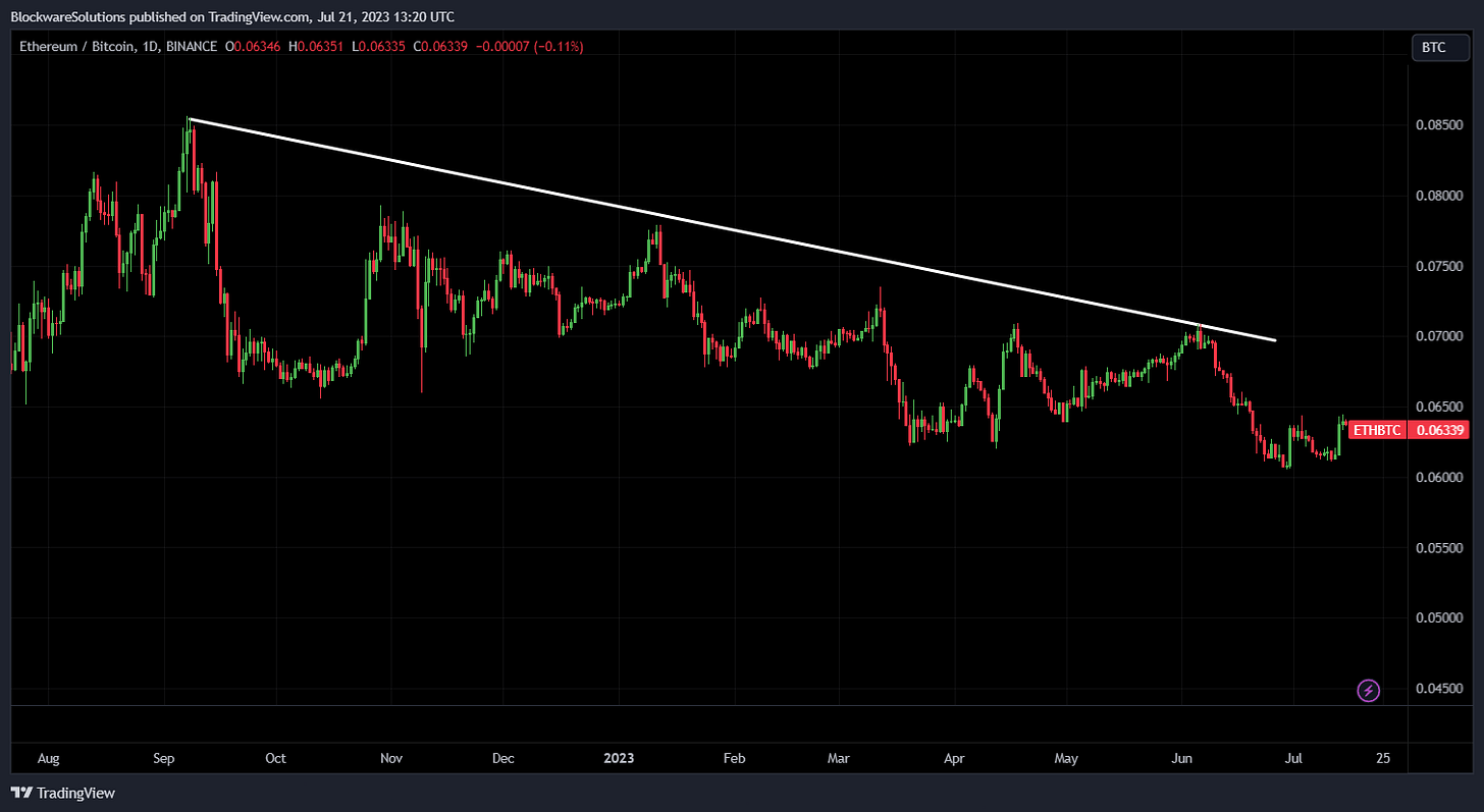 13. ETH / BTC has continued its months-long downward trend following “the merge.” This metric is a good proxy for the performance of alts as a whole vs BTC. It declined significantly during the regulatory crackdown on “crypto” exchanges; and the attempt to rebound those losses appears to be failing.