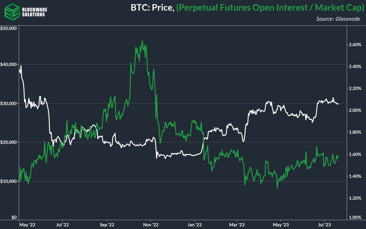 12. Perpetual futures open interest as a % of market cap (OI / MC) has remained flat over the past thirty days. This shows that there has not been a change in the risk appetite of futures traders, despite BTC holding this ~$30k mark for the past month. OI/MC remains relatively low, which means that spot will likely keep driving the price higher in the short to medium term as supply continues to slowly contract into the hands of long term holders.