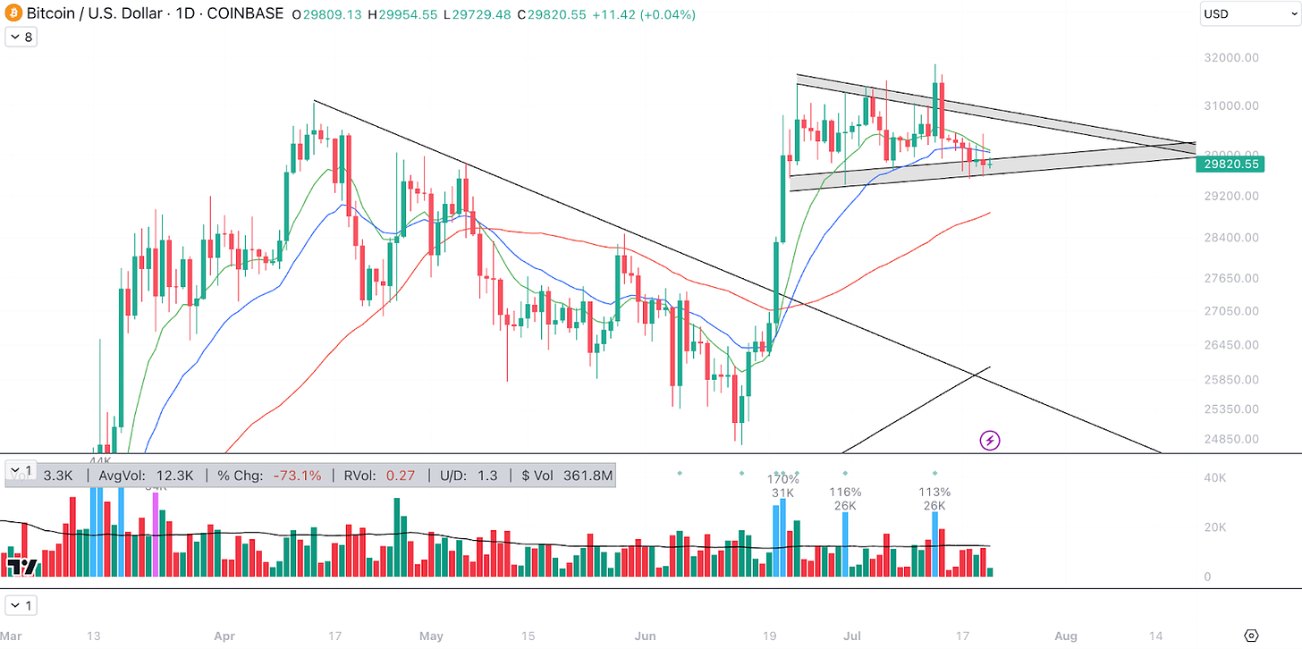 8. Bitcoin / USD. Unsurprisingly, Bitcoin has also seen a pullback this week within this current flag. BTC has been able to hold the lower limits of this range thus far, but keep an eye out for a break below ~$29,500 to signal a failed breakout this weekend.