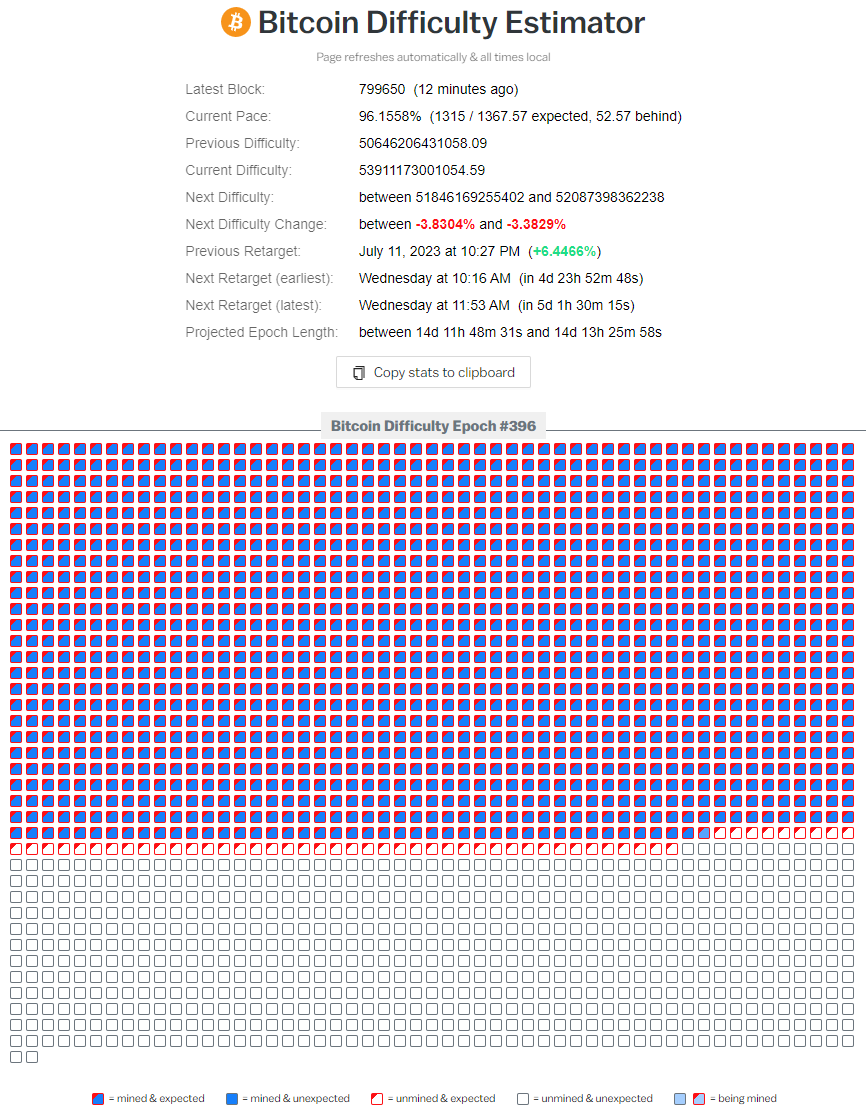 15. Next Difficulty Adjustment. We are now 5 days or so away from the next difficulty adjustment. Unsurprisingly, we’re not quite going to see another massive drop, but it does seem likely we see a small downward adjustment. It is currently estimated to be around 3.5%.