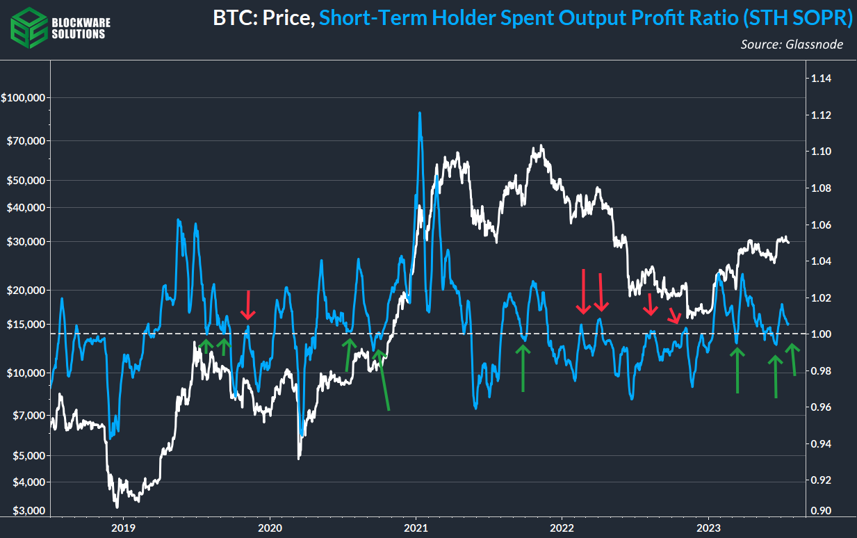 10. Short-Term Holder Spent Output Profit Ratio (STH SOPR) indicates that STHs, in aggregate, are moving coins at a profit. It appears to be nearing a rebound at breakeven which tends to signal local bottoms during bull markets.