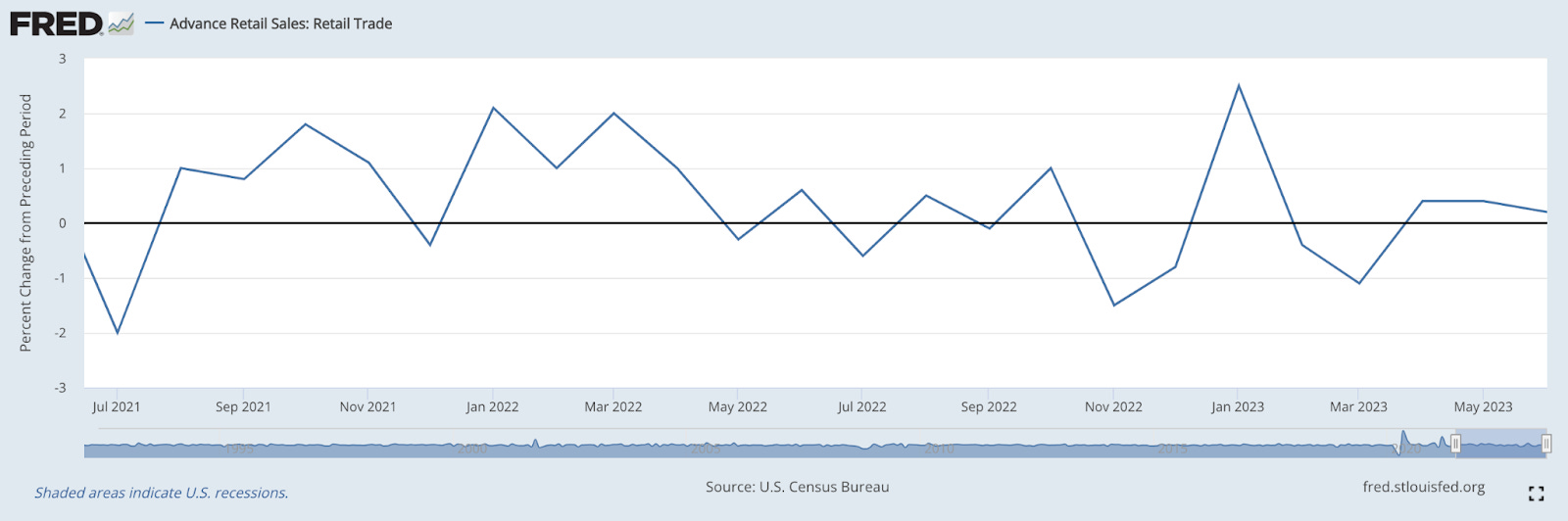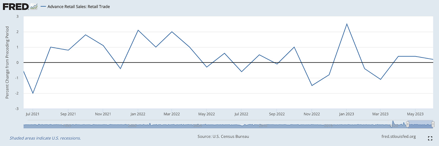 2. Advance Retail Sales. Retail sales rose in June for the third consecutive month. The consumer appears to be quite strong despite prospects of recession. This spending growth largely came from furniture, electronics and online shopping. Sales dropped in grocery stores and gas stations.