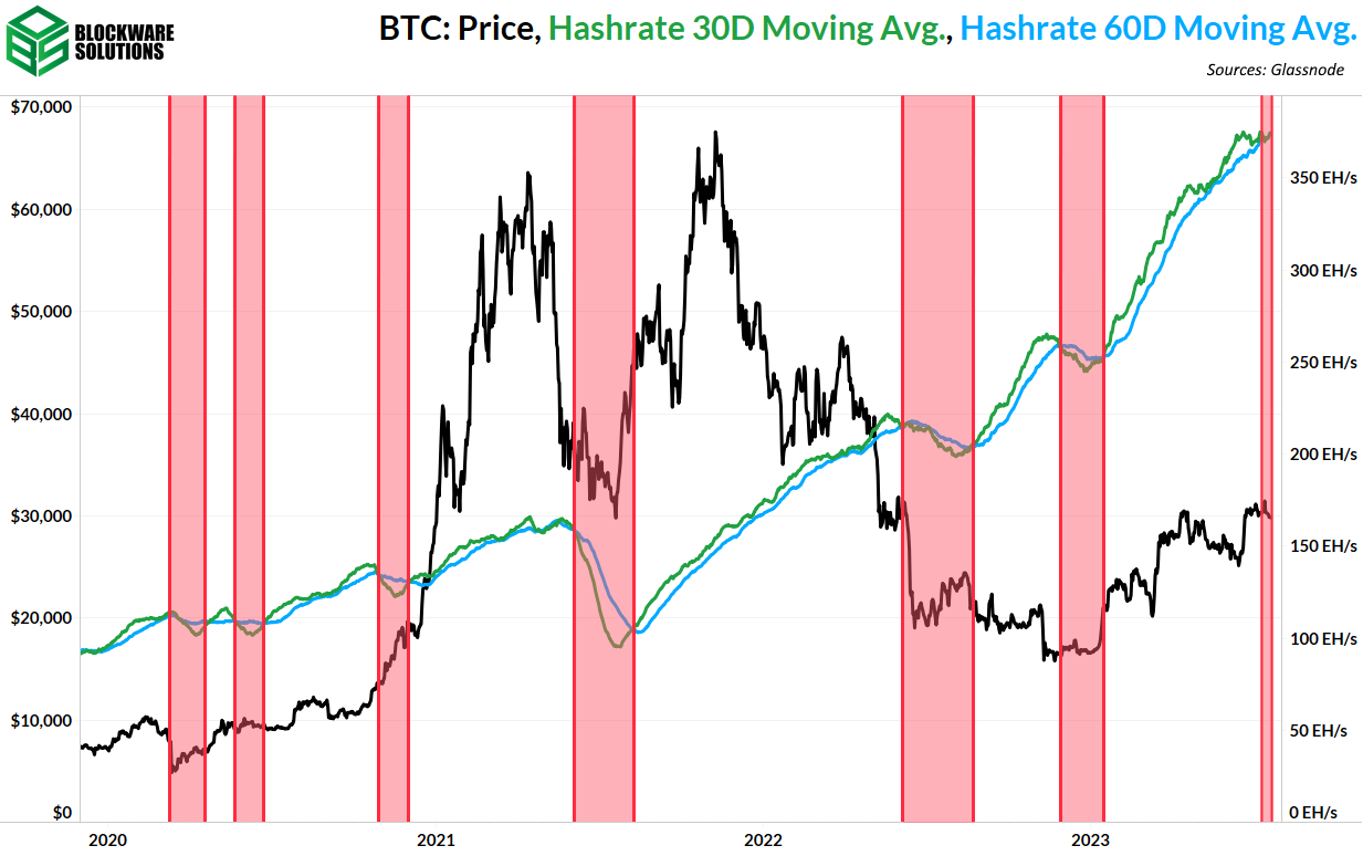 16. Hash Ribbon. A small “miner capitulation” as indicated by the Hash Ribbon metric recently occurred. This can likely be attributed to the significant downward difficulty adjustment at the end of June when miners were curtailing in the summer heat.