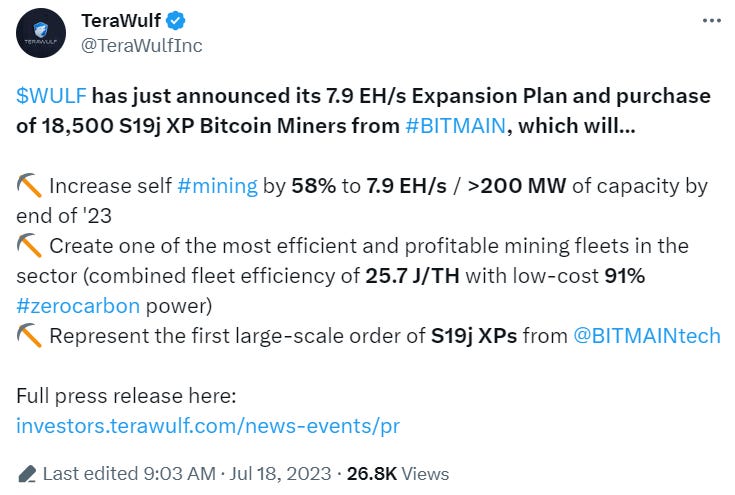 14. $WULF. Public miner TeraWulf is purchasing 18,500 Bitcoin ASICs following $RIOT and $CLSK who also have both made large ASIC purchases earlier this year.
