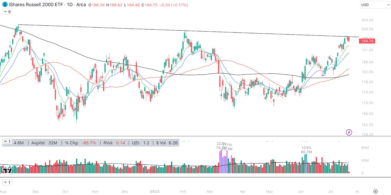 4. Russell 2000 ETF (IWM). Stocks have begun to see a pull back (as of the time of writing), after many weeks of strong gains. While there isn’t any major reason to believe this will be sustained for long, investors would be wise to adjust stop losses accordingly. The Russell 2000 small-cap ETF, as seen below, hit resistance this week.
