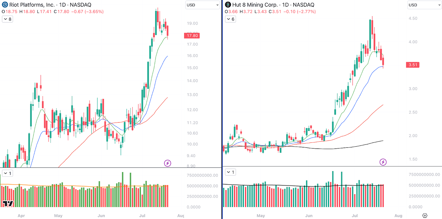 6. Riot Platforms vs. Hut 8 Mining. Bitcoin-exposed equities have also seen a pullback in recent days. This provides an excellent opportunity to spot names showing strength relative to the rest of the industry group. One example of this can be seen below, with RIOT pulling back to its 10-day EMA, while HUT came down to its 21-day EMA. Shallow pullbacks on light volume are ideal, and should be welcomed by those who missed the initial move higher.