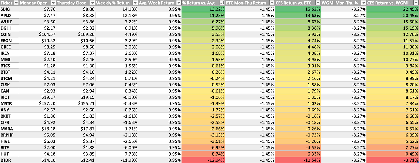 7. Bitcoin-Exposed Equity Comparison. Below, as always, is the table comparing the Monday-Thursday performance of several Bitcoin-exposed equities, Bitcoin, and Valkyrie's Bitcoin Miners ETF. Notice how most individual names are outperforming BTC and WGMI here. While sellers have regained some control this week, it doesn’t appear too overwhelming.