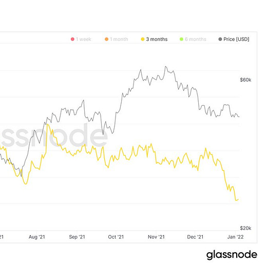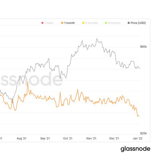 For the last month, Bitcoin has been in a tight range between $52,000 and $45,000. During that time period, I’ve been constantly talking about the build-up of open interest, specifically stablecoin margined open interest. In the perpetual futures market, rather than trading the underlying asset, you are trading contracts or what are essentially bets on the Bitcoin price. The reason people use these contracts is because of the massive amount of liquidity they offer (the most liquid Bitcoin product) and the ability to access cheap leverage. Open interest tells you the number of contracts that have been… opened, or are currently open. People constantly ask “can you show short open interest versus long open interest?” the answer is no. Why? There is a long and a short on both side of every contract. Open interest does not tell you about positioning of market participants (we’ll talk about that in a second), but rather shows you the amount of “pressure” through leverage position that is built up. In that sense I often look at the build-up of open interest as a proxy for when to expect major volatility in the BTC market. This paired with the fact that implied volatility (the volatility that is priced into the Bitcoin options market) was at the lowest it’s been since the summer, made me feel that volatility was inbound. You can buy non-directional volatility through the options market or something called MOVE contracts, but for the record, I did not execute on this. What good is analysis if executed poorly, lesson learned. Here’s my tweet from Monday: