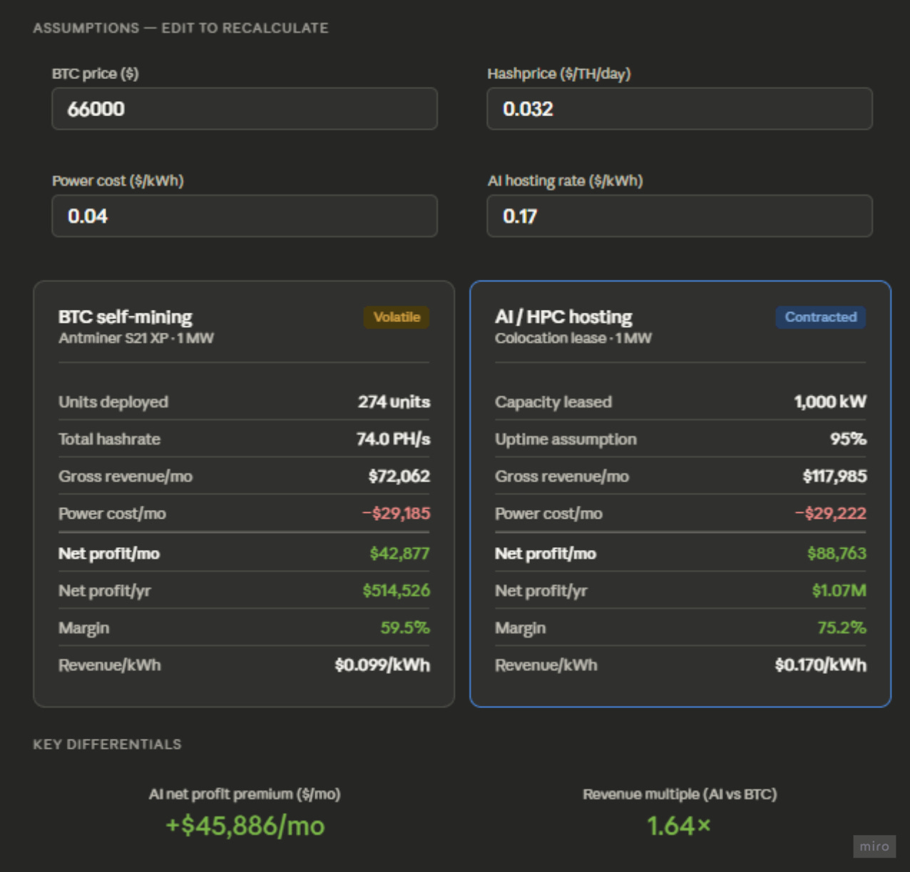 The table below provides a side-by-side comparison between Bitcoin Mining (at current market prices) or Ai hosting (at $0.17/kWh).