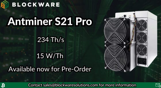 The Antminer S21 Pro was recently revealed by Bitmain, clocking in at a whopping 234 TH/s and 15 W/Th. Blockware is now accepting pre-orders for this machine which is expected to come online the first week of August.