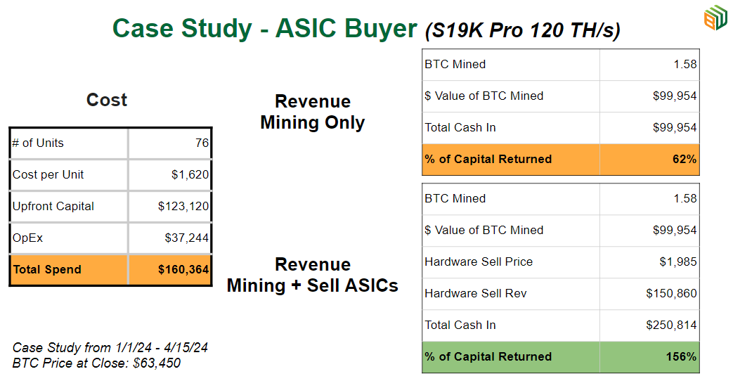 Had this client simply mined Bitcoin without liquidating their ASICs, they would have recouped 62% of their capital during this period. However, by selling the rigs at a higher price after mining with them for a few months, they returned 156% of their capital.