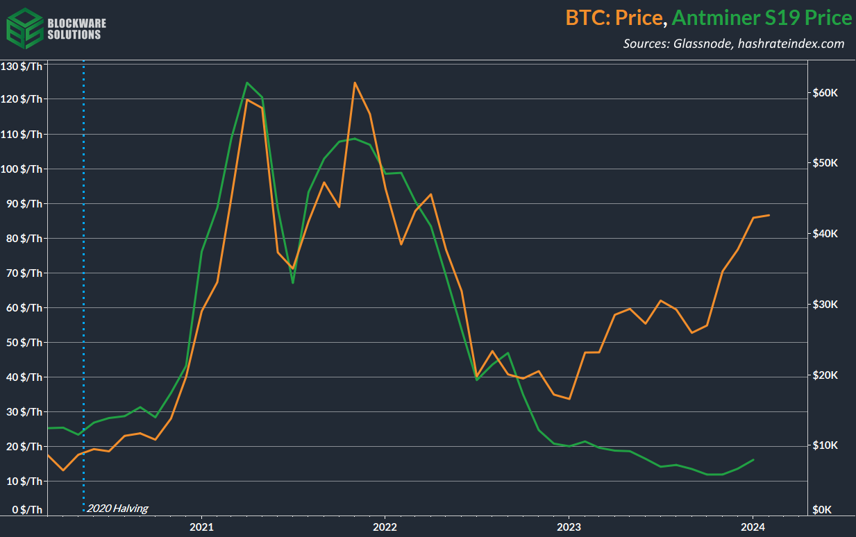 The price of ASICs have historically moved in near lock-step with the price of Bitcoin. According to previous Blockware research, S19’s had a 96% correlation with the price of Bitcoin from 2020 to 2022.
