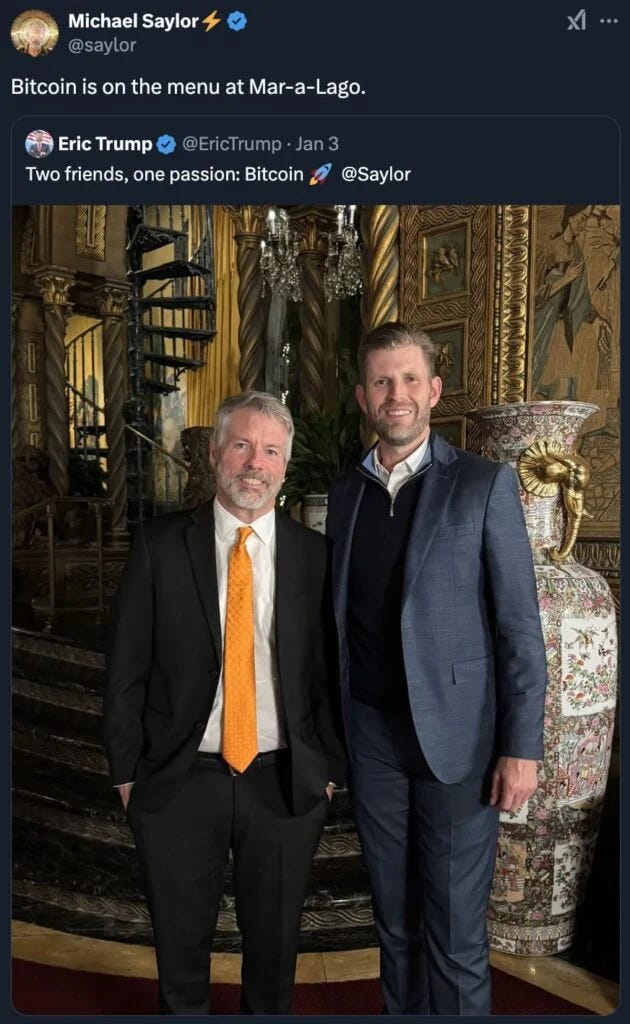 Investors have their sights set on Monday, January 20th, as President-Elect Donald Trump will return to the Oval Office. The next President and his team have the right people in their ear when it comes to Bitcoin policy. Case in point, Michael Saylor recently made a trip to Mar-a-Lago.