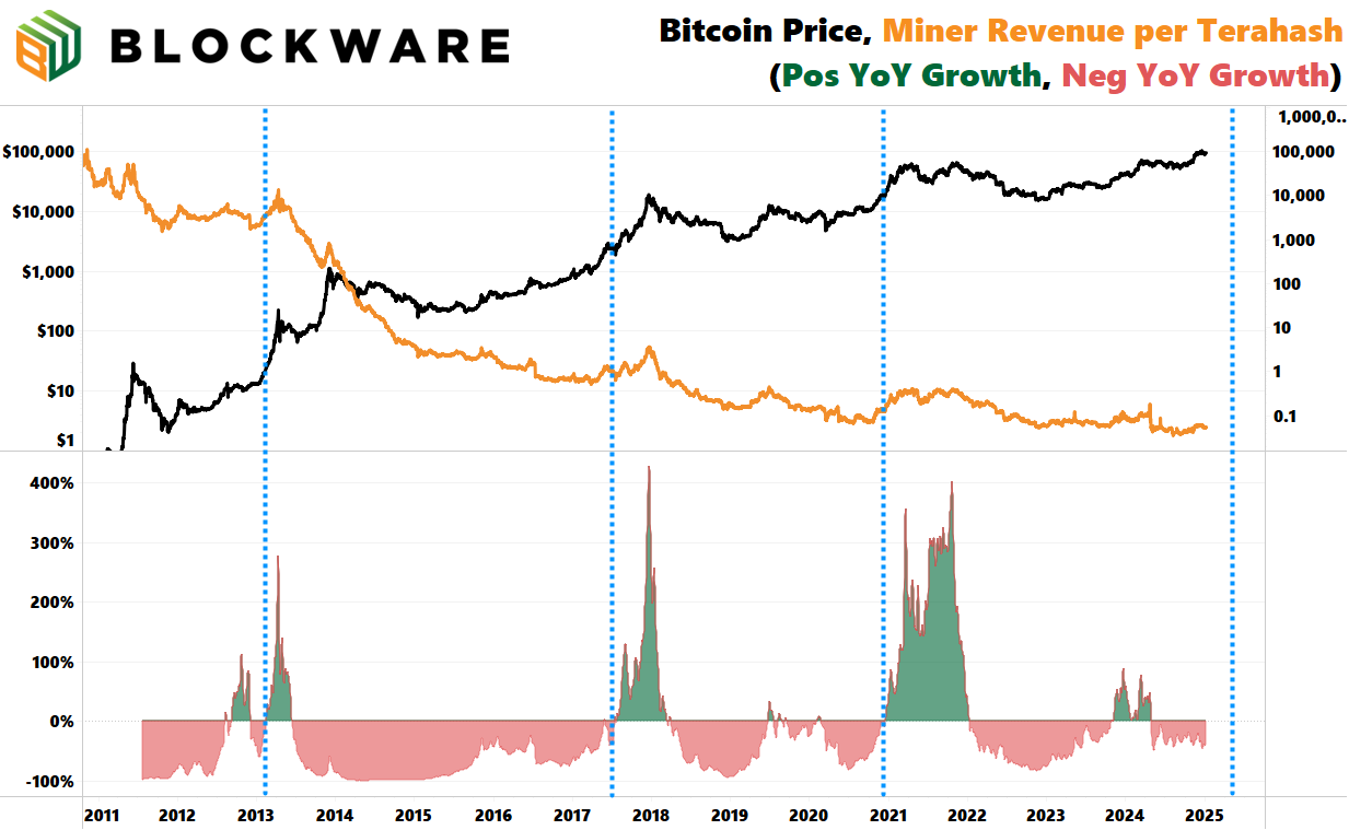 The ‘parabolic’ phase of past bull markets has been denoted by positive year-over-year growth in Hashprice (note the exponential growth in the Bitcoin price in the months after the dotted blue lines). We expect that to be the case in this epoch as well – but it is likely a few months away.